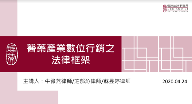 The IRPMA on April 24 hosted a webinar for IRPMA members on the legal framework for pharma digital marketing, with keynote speeches by three lawyers specializing in pharmaceutical industry practice from Lee and Li: Jill Niu, Katherine Juang (both partners of this firm) and Yuting Su. The purpose of this webinar is to enhance the legal knowledge of IRPMA members by interpreting the legal framework and legal risks of pharma digital marketing.
