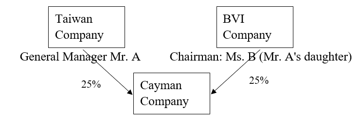Here we give an example.  Mr. A is the general manager of a Taiwan company, while his daughter is the chairman of a BVI company, and the two companies respectively owns 25% of the shareholdings of the Cayman company: