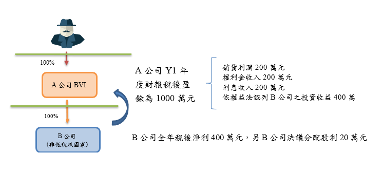 茲舉一例說明之,假設A公司為國內個人甲之CFC,甲持有A公司100%股權,A公司持有位於非低稅負國家或地區B公司100%股權,A公司Y1年度財報稅後盈餘為1000萬元(銷貨利潤、權利金收入及利息收入各200萬元與依權益法認列B公司之投資收益400萬元,另B公司決議分配股利20萬元)。 CFC公司(A公司)當年度盈餘為多少?